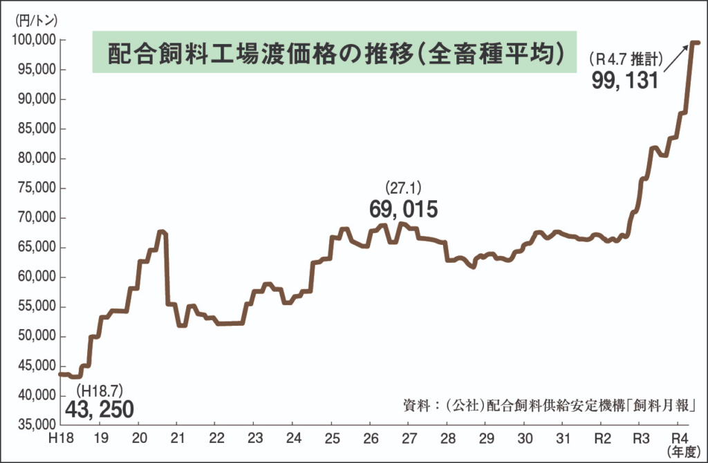 いわゆる配合飼料の価格も、ここ数年で大きく上昇しています。